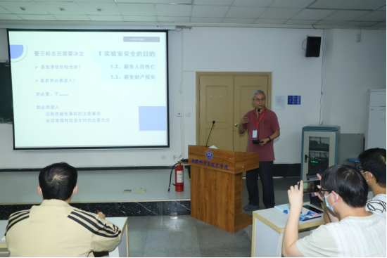 安全健康教育中心教员龙杨军、安全管理工作组组长周保范、组员唐丽云分别就“英国正版365官方网站消防安全状况和防范措施”、“英国上市公司官网365实验室安全总体状况和防范措施”、“实验室保密安全”等进行了讲解。