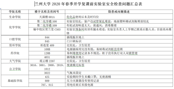 4月底,学校实验室与设备管理处的《实验室安全工作简报》(2020第3期)对全校实验室安全问题检查情况进行了通报,对存在安全隐患的学院(见下表)以书面 “整改通知书”形式督促落实整改。3-4月份,公司实验室安全形势总体平稳,相关检查均未发现英国上市公司官网365存在明显安全隐患,公司未被要求整改。