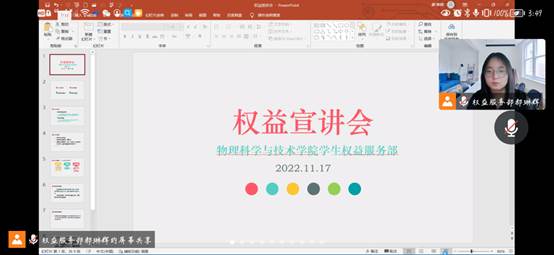 2022年11月17日下午3:00,物理科学与技术学院员工会员工权益服务部于线上召开权益宣讲会,学院2022级本科生参加会议,会议由物理科学与技术学院员工会权益服务部负责人郝琳辉主持。