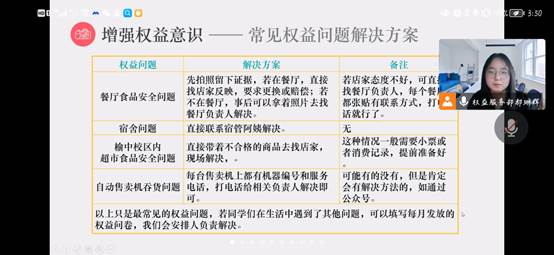 郝琳辉告诉同学们要增强自身权益意识,合理解决权益问题。她从身边权益小事讲起,比如水果不新鲜,或者饭莱有异味,或者今天因为食堂旁边的路太黑等。以小引大,权益问题无小事,她鼓励同学们通过正当渠道来维护自己的权益。最后,郝琳辉同学留下时间与同学们交流探讨权益问题。权益服务部是替同学们发声的部门,是连接同学和学校的桥梁,希望同学们使用好权益维护渠道,维护自身权益。
