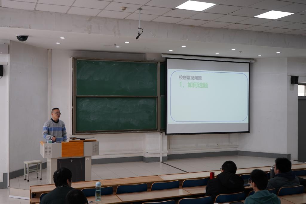 刘贵鹏就如何做好校创、校创的具体要求及内容等方面作详细介绍。他指出,要做好校创首先应明确大学学习与高中学习的不同之处,当下知识更迭速度极快,这对同学们的学习能力要求极高,同学们应学会在现实生活及学习过程中发现问题并自主查阅资料、运用知识以解决问题,在这个过程中不断提升自我。他指出,做好校创除了要具备一定的个人学习能力还应具有团队精神,当下的科研仅靠个人是难以做出成果的,这就对团队精神提出了要求,同学们应具备分工协作意识,既能做好自己负责的部分,又能有机整合团队成员的工作。他以微电子相关课题为例,为同学们介绍了校创的侧重点、能力的具体要求以及课题的选择偏向,并对相关的竞赛事宜作了简单介绍。最后,刘贵鹏指出,认真做好校创对于日后的研究生学习、专业竞赛或是求职都将有所助益。训练思维、锻炼能力,为未来的科学需要积攒经验能力才是校创存在的意义及目的,校创带给同学们的自信、责任及坚持等品质将使同学们终生受益。