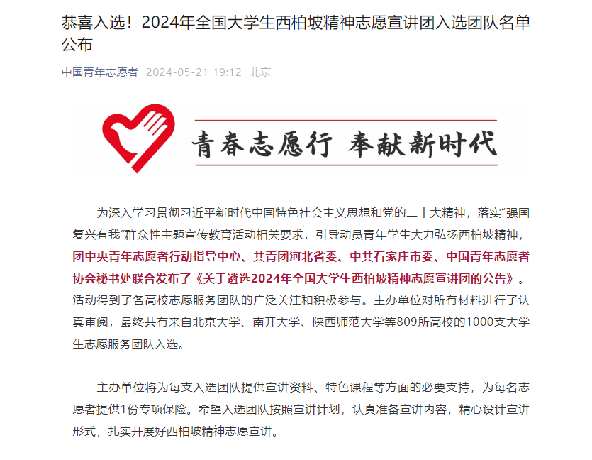 近日,团中央青年志愿者行动指导中心、共青团河北省委、中共石家庄市委、中国青年志愿者协会秘书处联合发布了《关于遴选2024年全国老员工西柏坡精神志愿宣讲团的公告》。英国正版365官方网站物理科学与技术学院“红色探寻”西柏坡精神志愿宣讲团成功入选。