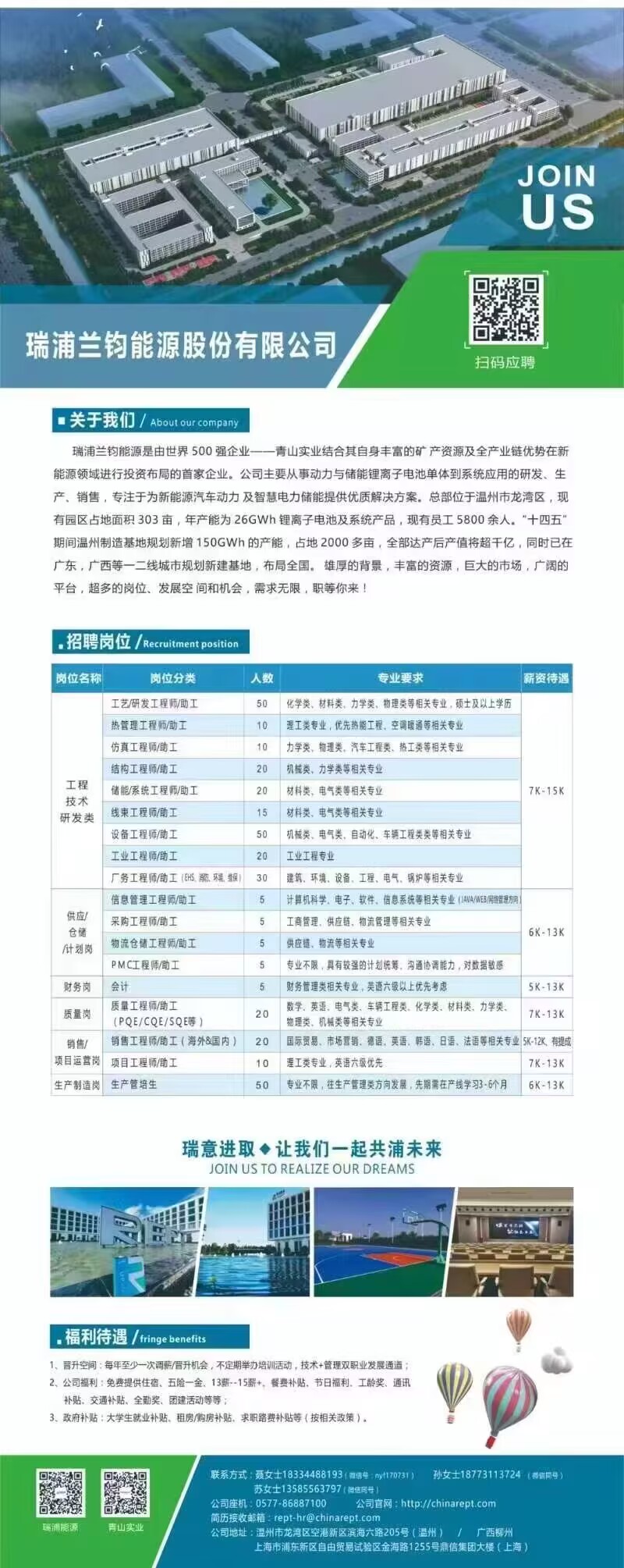 瑞浦兰钧能源是由世界500强企业-青山实业结合其自身丰富的矿产资源及全产业链优势在新能源领域进行投资布局的首家企业。主要从事动力与储能锂离子电池单体到系统应用的研发、生产、销售,专注于为新能源汽车动力及智慧电力储能提供优质解决方案。总部位于温州市龙湾区,现有园区占地面积303亩,规划年产能为26GWh锂离子电池及系统产品,现有员工5800余人。雄厚的背景,丰富的资源,巨大的市场,广阔的平台,超多的岗位、发展空间和机会,需求无限,职等你来!官网:https://chinarept.com/,微信公众号:瑞浦兰钧能源